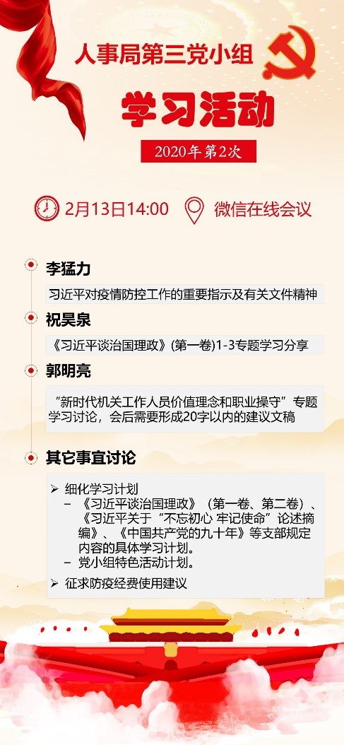 根据局党支部统一安排,2月13日,人事局党支部第三党小组组织线上集体学习会。会议深入学习了习近平总书记对疫情防控工作的重要指示及近期有关文件精神,形成了学习材料汇编,讨论了在当前疫情形势下如何推进各项工作。祝昊泉同志重点报告了《习近平谈治国理政》(第一卷)中的坚持和发展中国特色社会主义、实现中华民族伟大复兴的中国梦、全面深化改革等三个专题的学习心得。郭明亮同志领学“新时代机关工作人员价值理念和职业操守”专题有关文件,会议讨论了相关建议。最后根据人事局党支部年度计划,细化了第三党小组学习和打卡计划。